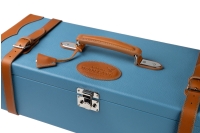 More than just a journey, this unique blue and brown grained leather trunk crafted by Bordeaux House Alexandre Mareuil contains what Gascony has treasured for over 700 years: Armagnac. These elixirs are enclosed in bottles with brown bases and blue tops, reminiscent of Gascony's rolling hills and blue skies.