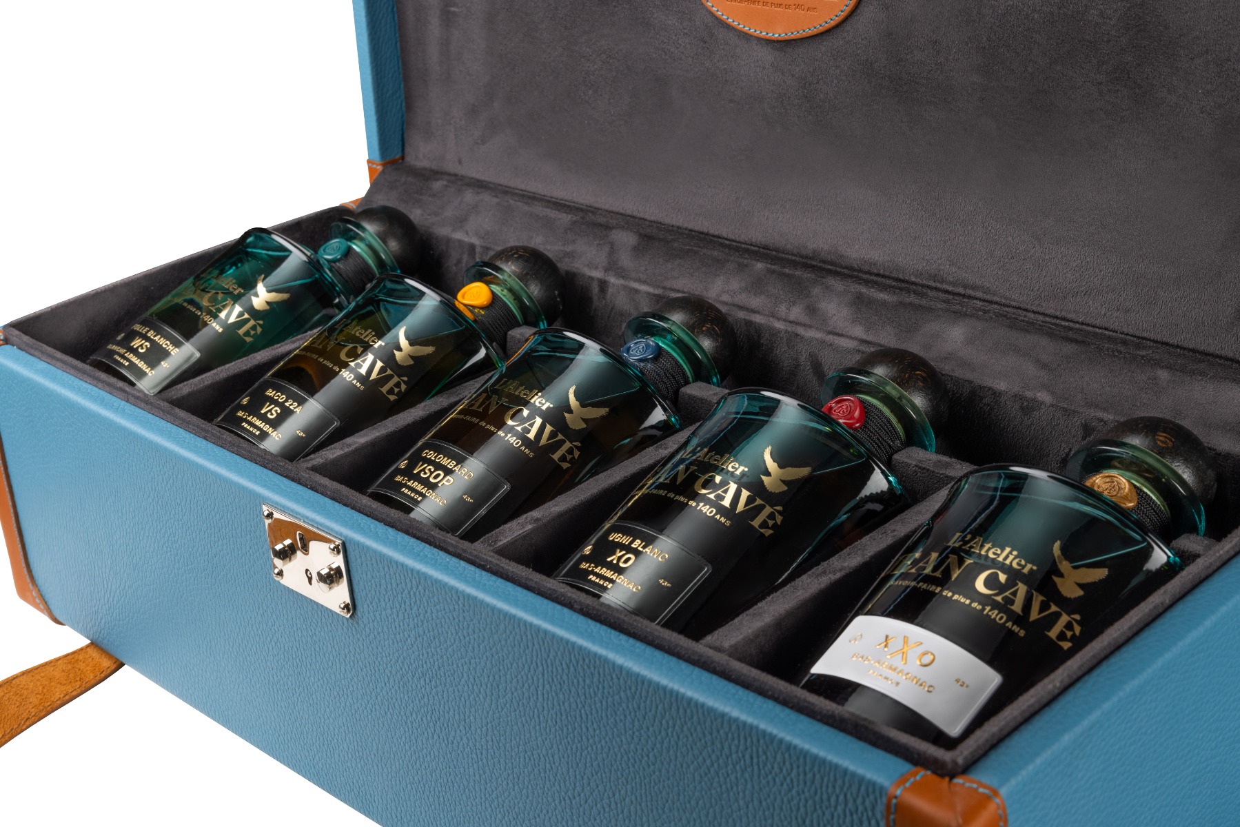 Plus qu’un voyage, cet écrin unique de cuir grainé bleu et marron réalisé par la Maison Bordelaise Alexandre Mareuil enferme ce que la Gascogne à de plus précieux depuis plus de 700 ans : l’Armagnac. Ces élixirs sont enfermés dans bouteilles dont la base est marron et le haut bleu pour rappeler le terroir vallonné de la Gascogne, et, son ciel bleu.